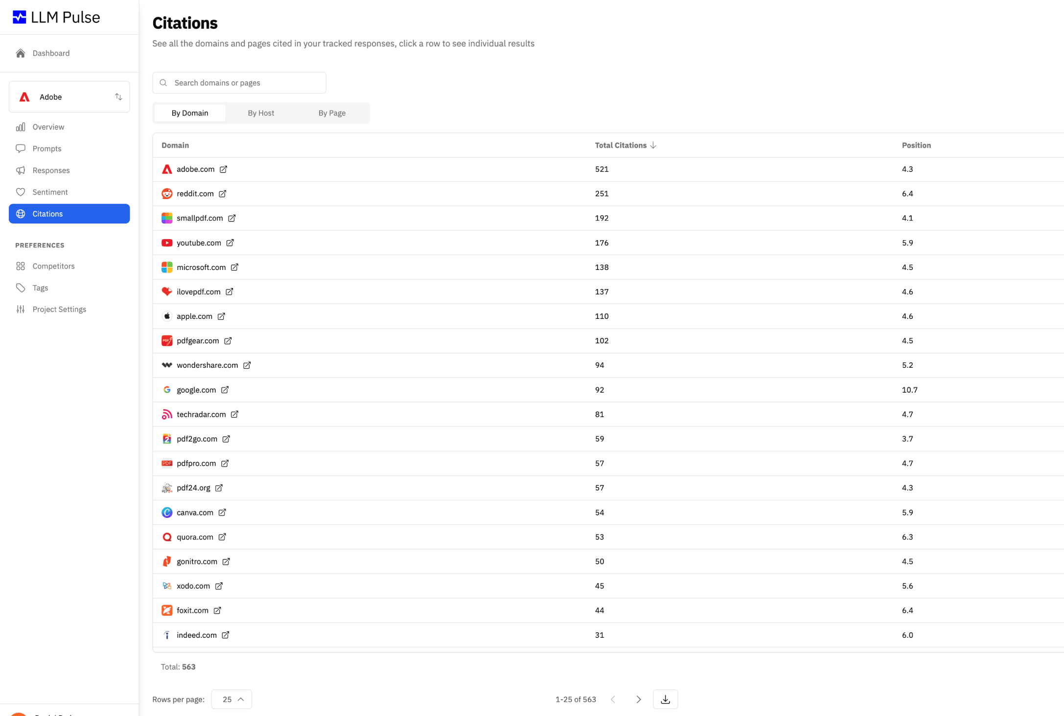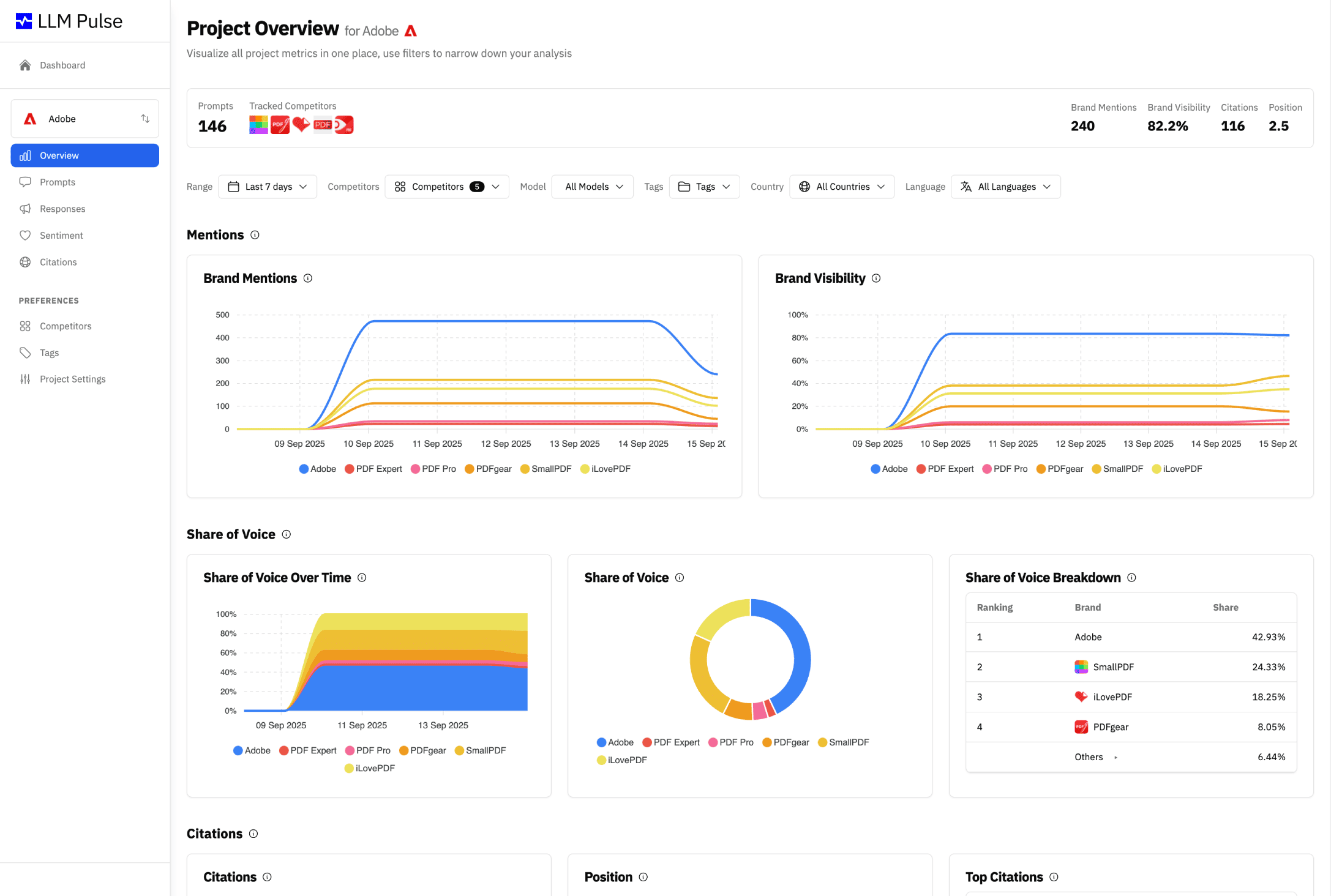 LLM Pulse is your radar in the world of AI search. Track your key prompts over time, see how AI models are referencing your brand, and how visible you are versus your competitors, from Google AI Overviews to ChatGPT.