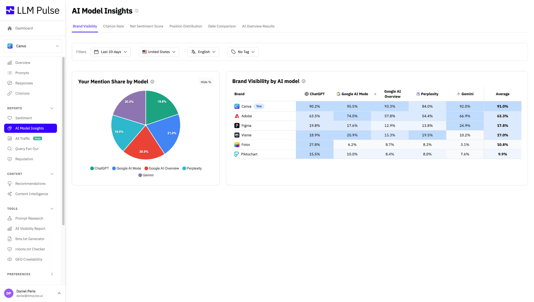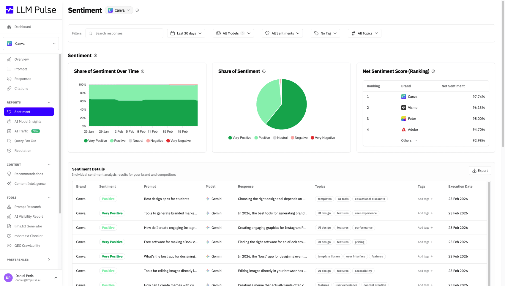 LLM Pulse captures the full AI response, extracting brand mentions, citations, and sentiment in real time.