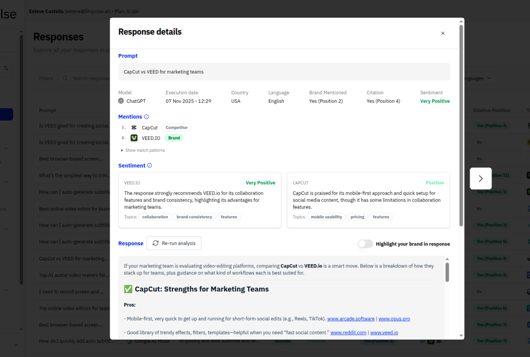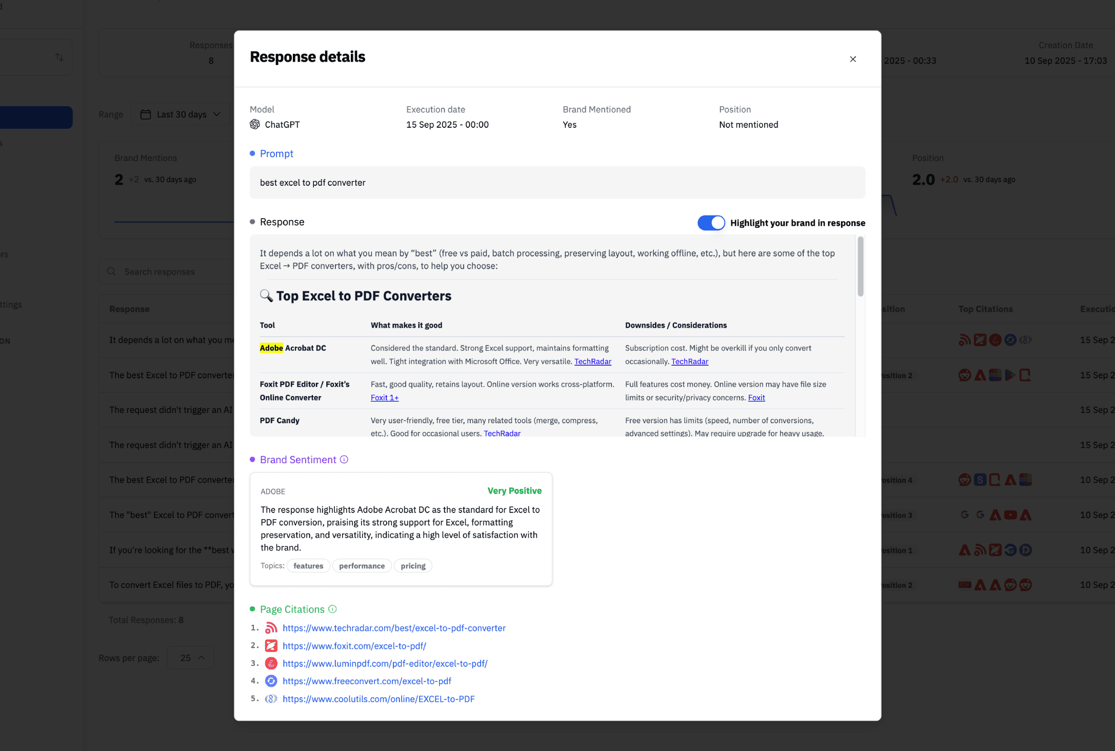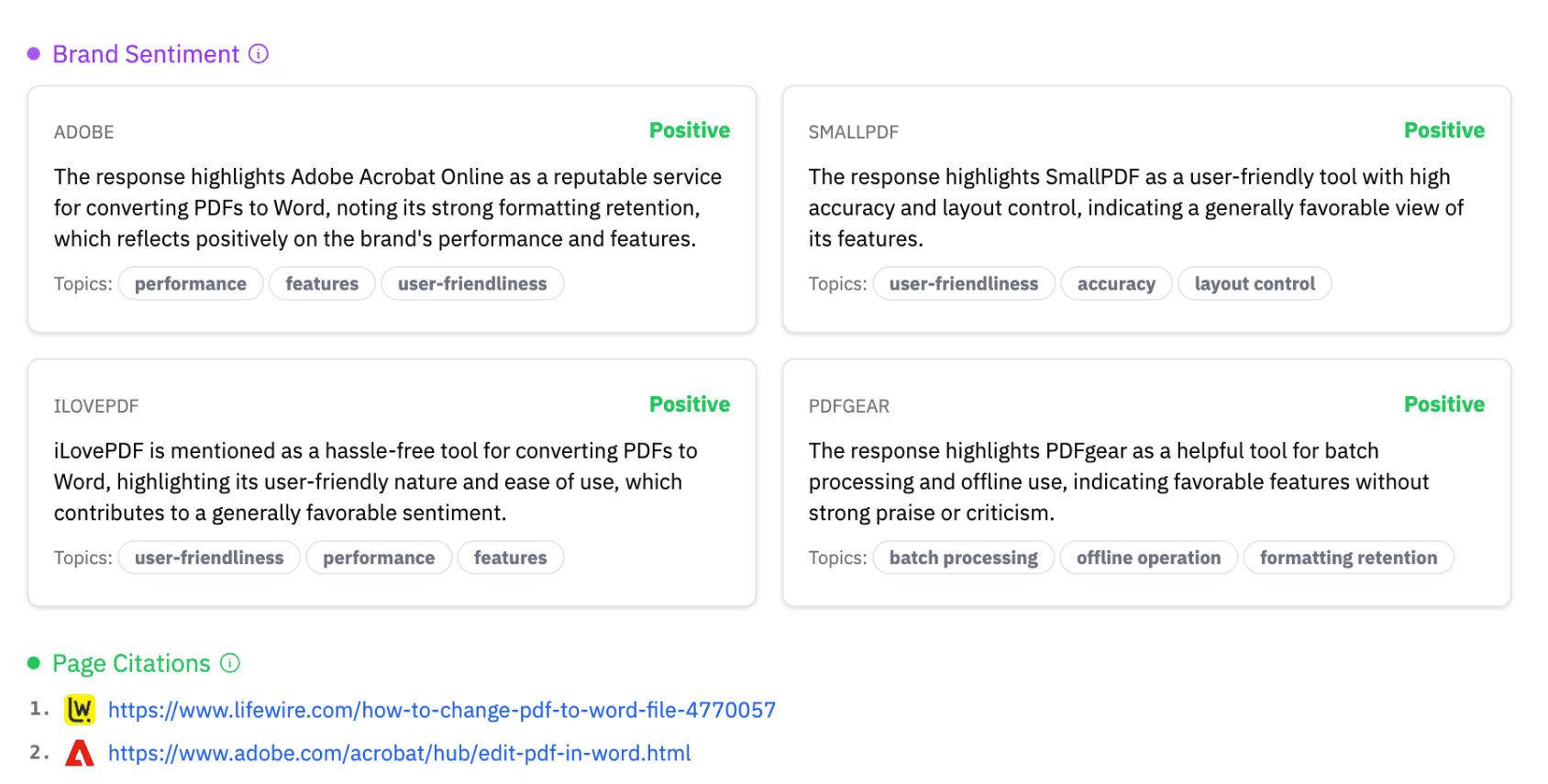 Analyze sentiment across all responses and LLMs to see if AI loves or hates your brand