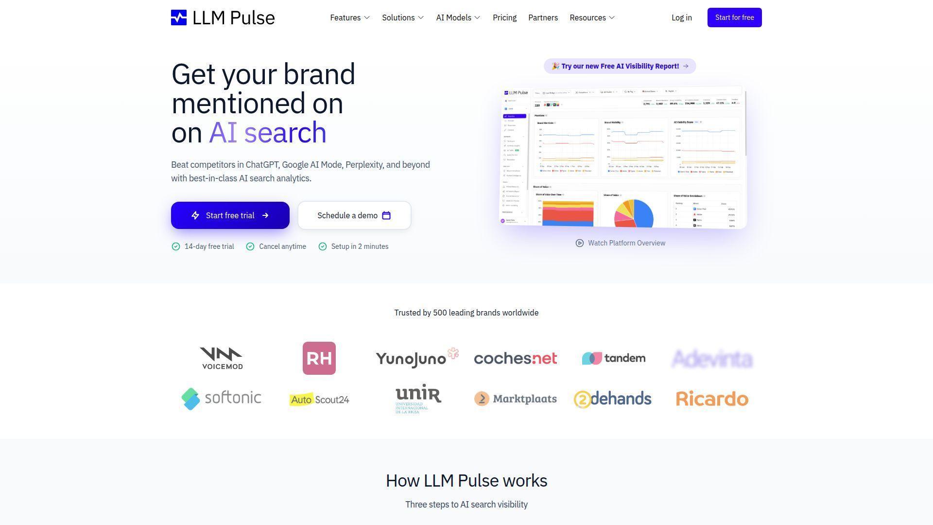 LLM Pulse is a dedicated AI visibility analytics platform built from the ground up to track how brands appear across ChatGPT, Perplexity, Gemini, Google AI Mode, and AI Overviews. Unlike tools that bolt AI tracking onto existing SEO platforms, LLM Pulse treats AI model monitoring as its core product — and the depth shows.