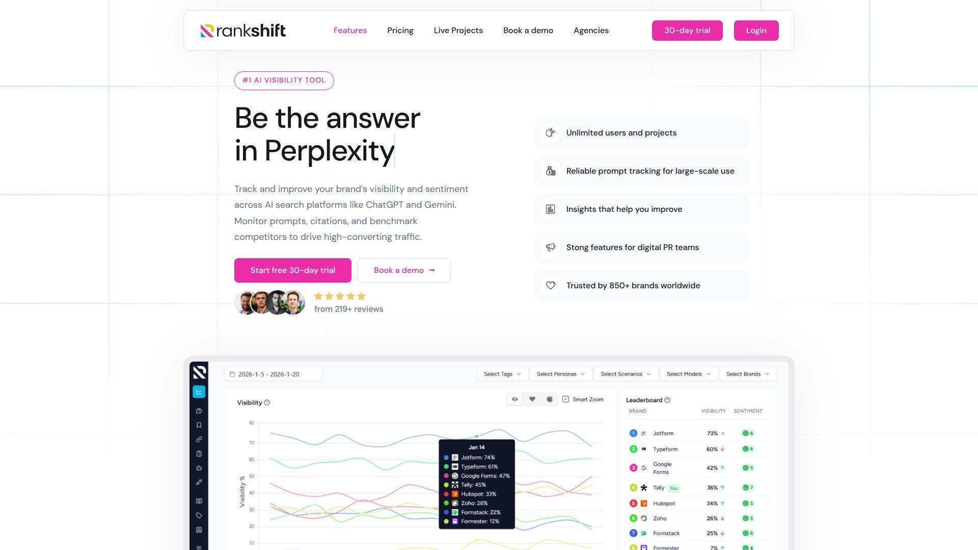 | Rankshift | Competitive analysis | Competitor benchmarking | Perplexity, Gemini | Weekly | $59/mo |