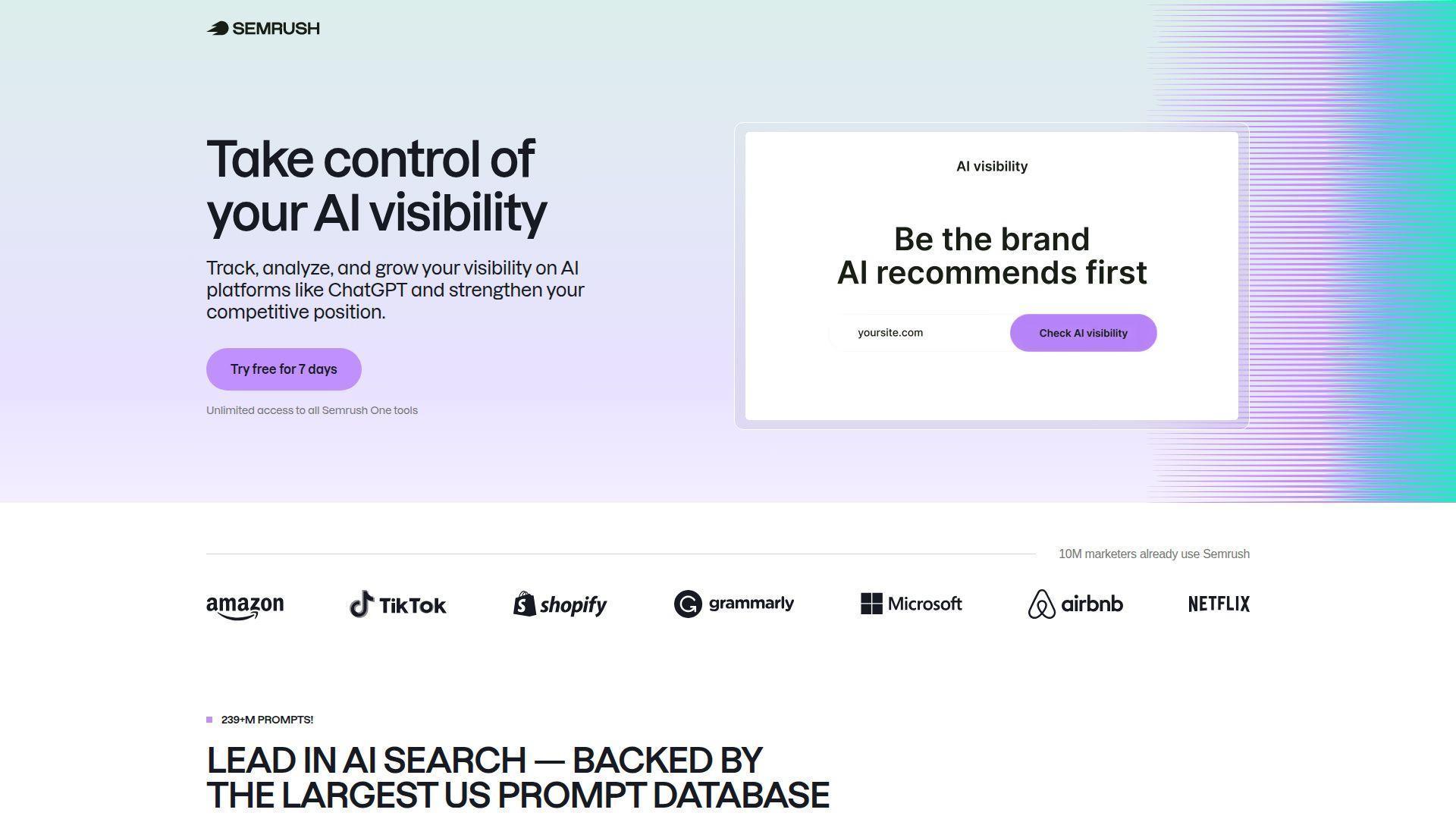 - Technical SEO tools (site audit, backlink monitoring) alongside AI tracking