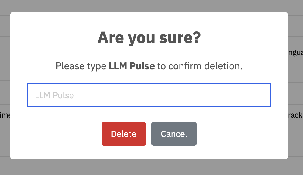 A confirmation window will appear asking you to type the project name to confirm the deletion. In this case, type “LLM Pulse” in the field provided and click the “Delete” button.