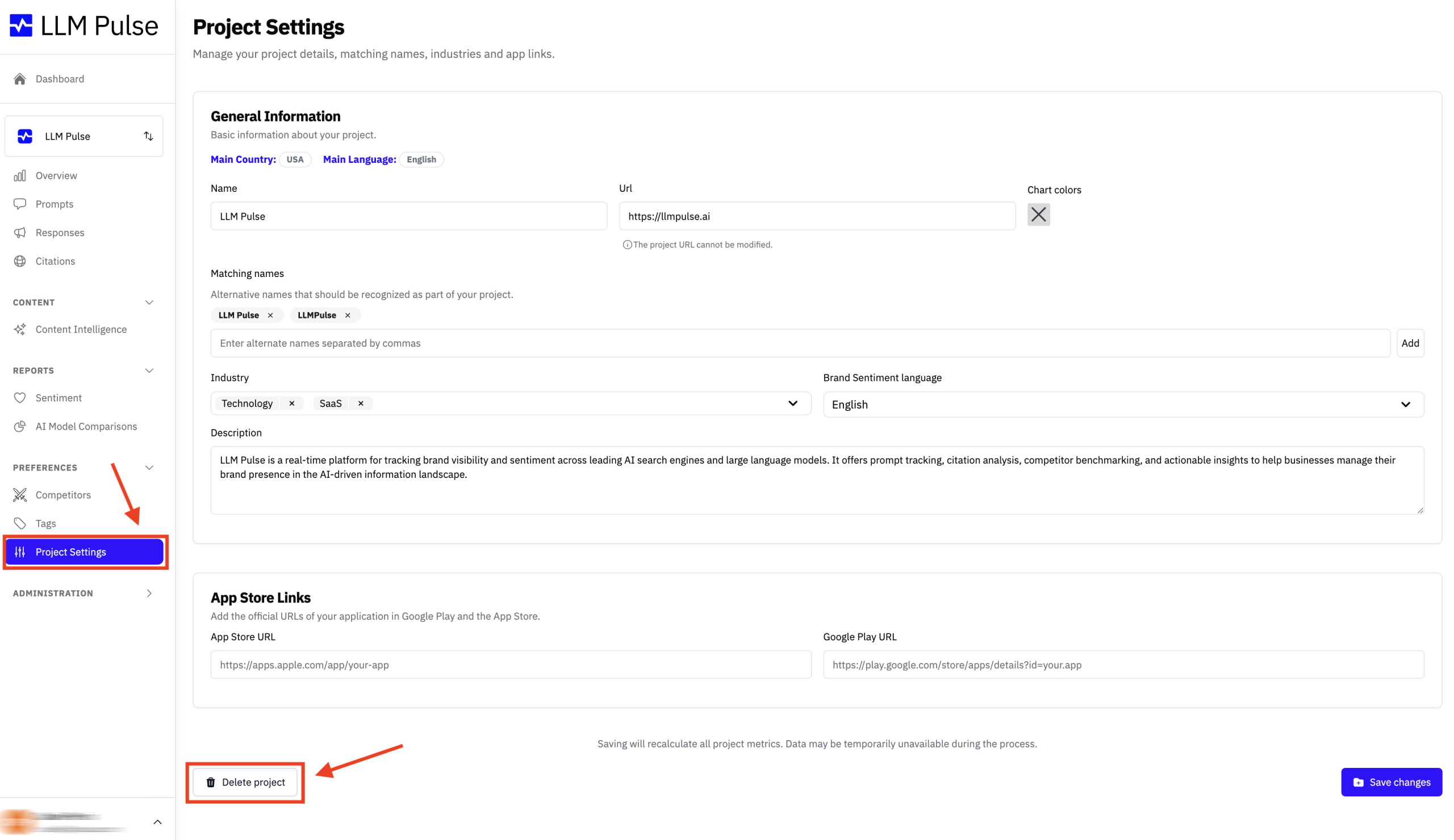 To delete a project in LLM Pulse, first, go to the “Project Settings” section located in the left sidebar under “Preferences.” Once there, you will see the option to delete your project at the bottom of the page. Simply click the “Delete Project” button to proceed.