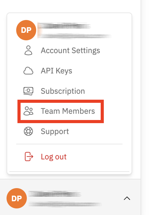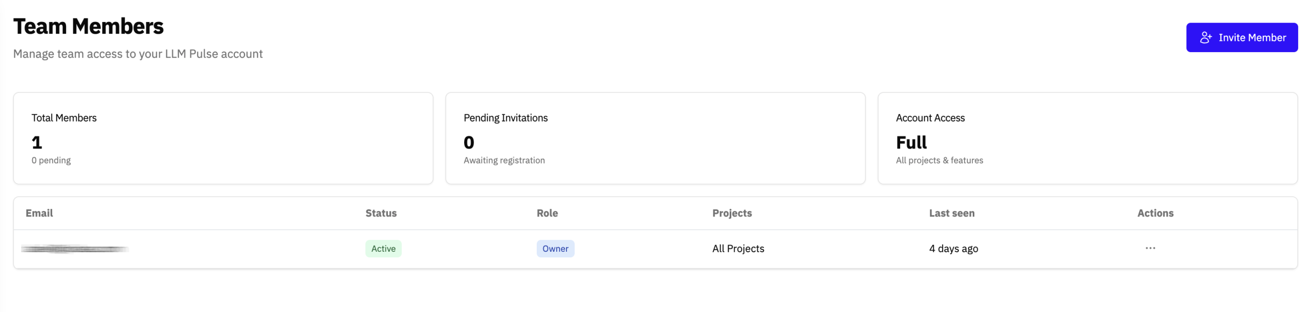 You can add team members to your LLM Pulse account from the “Team members section”. This option is available in the user menu, located in the bottom left corner of the platform.