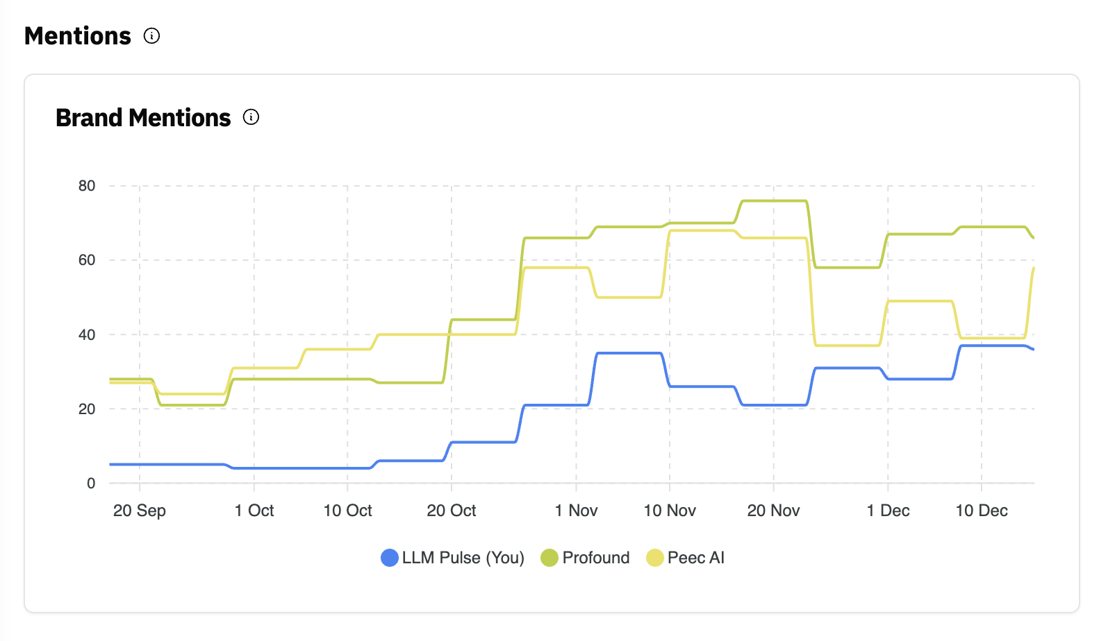 You can see the number of your own and competitors’ Brand Mentions across all monitored models in Overview > Mentions > Brand Mentions.
