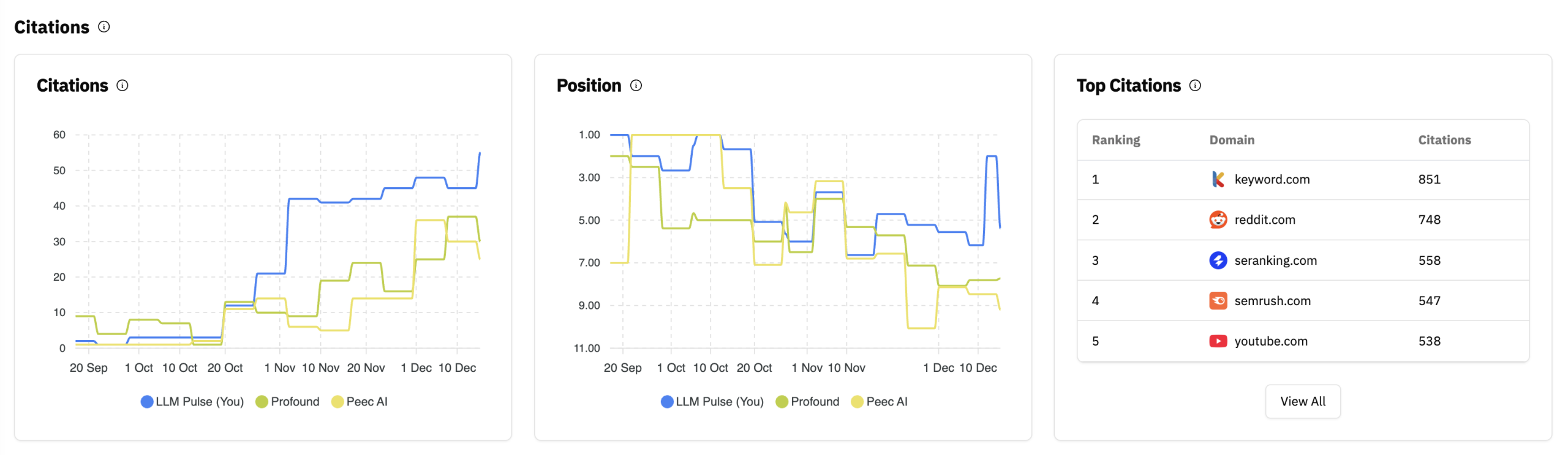 Citations can be analyzed at different levels in LLM Pulse. From Overview > Citations, teams can see how often their own domain and competitors’ domains are cited across all monitored models, as well as trends over time and Average position. At prompt and response level, it is also possible to inspect which specific sources an LLM used to answer a given query.