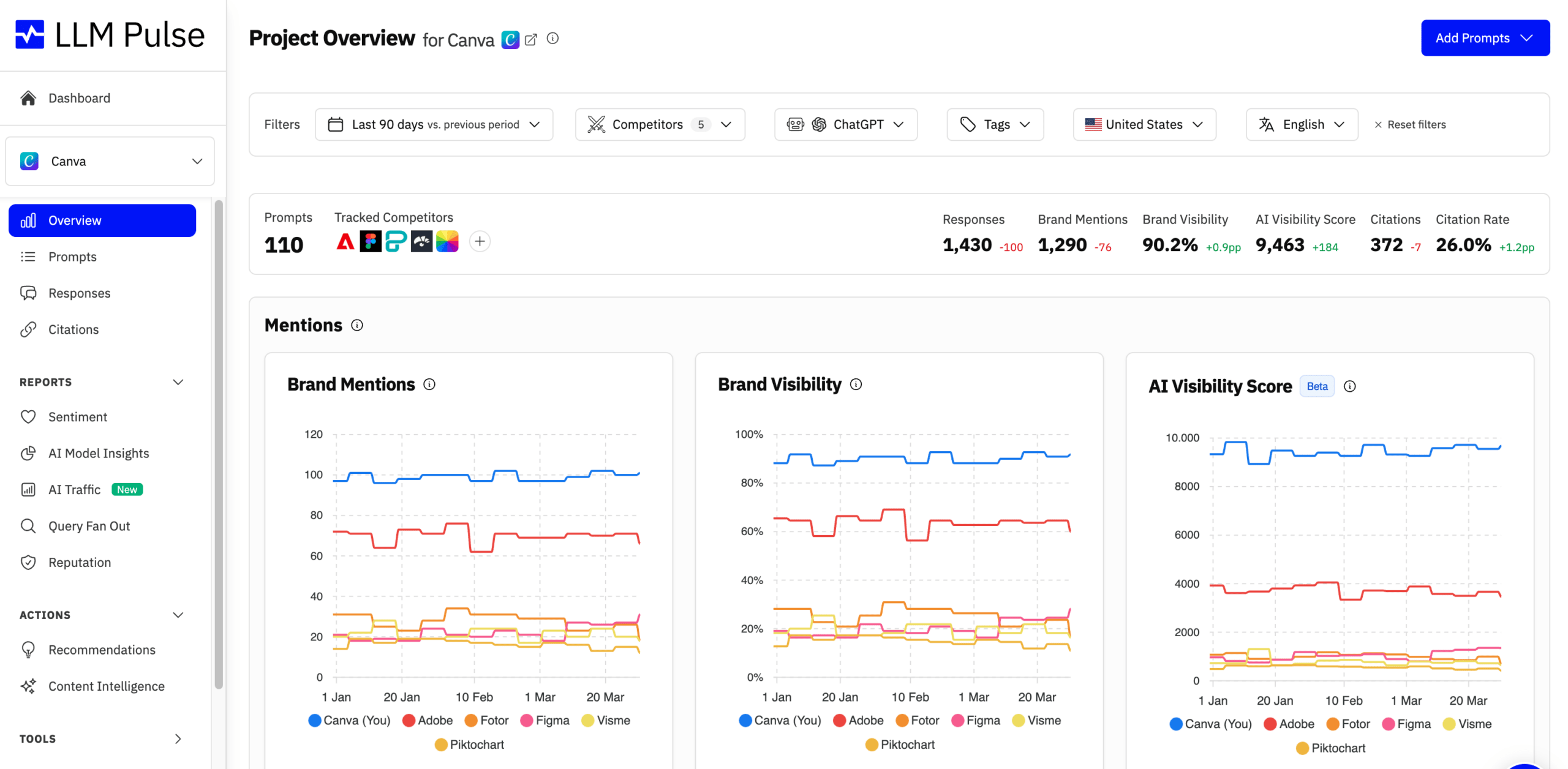 LLM Pulse is purpose-built for this. It continuously monitors how your brand appears across ChatGPT, Perplexity, Google Gemini, Google AI Mode, and AI Overviews — tracking mentions, citations, and sentiment in AI-generated responses. Plans start at €49/month with a 14-day free trial and unlimited seats, so your entire marketing team can access the data.