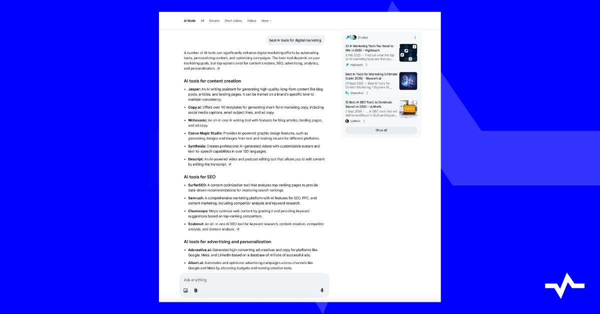 - Open Google AI Mode and type queries like “top SaaS startups in Europe” or “best AI tools for digital marketing”