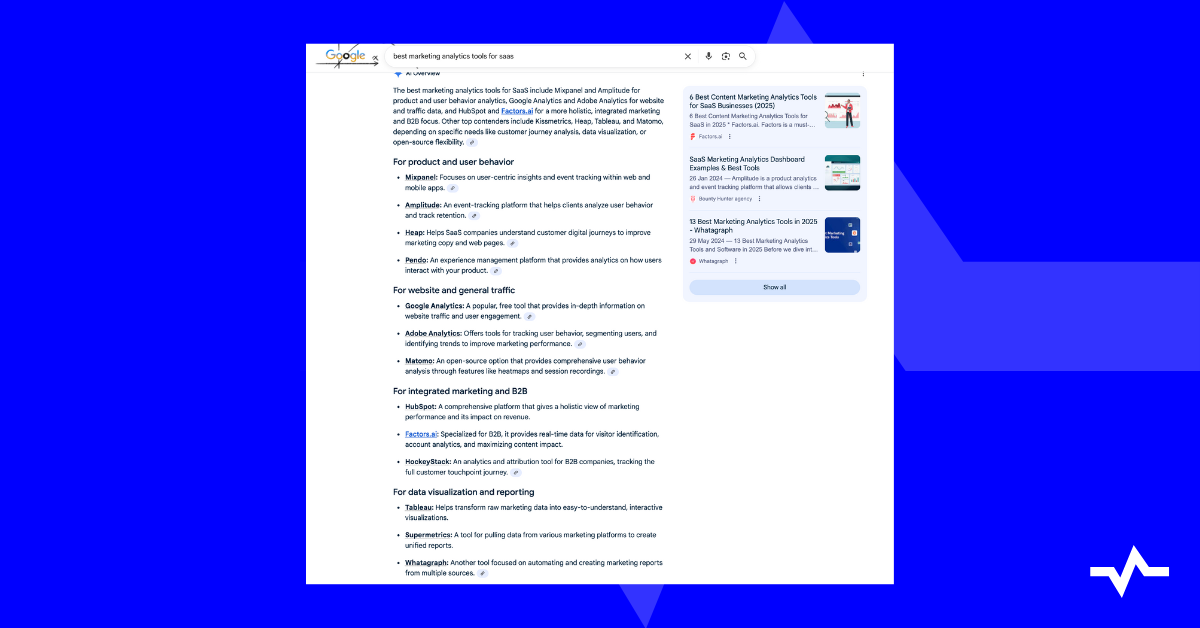 - Go to Google and search for queries that trigger AI Overviews, such as “best marketing analytics tools” or “how to improve online visibility”